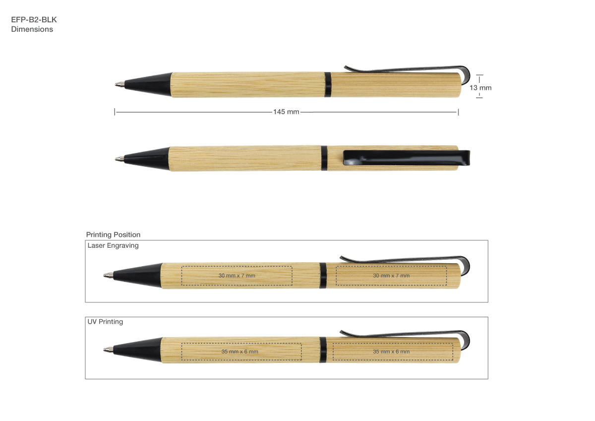 Twist Action Bamboo Ball pens with black color Metal Clip, ring, and tip.