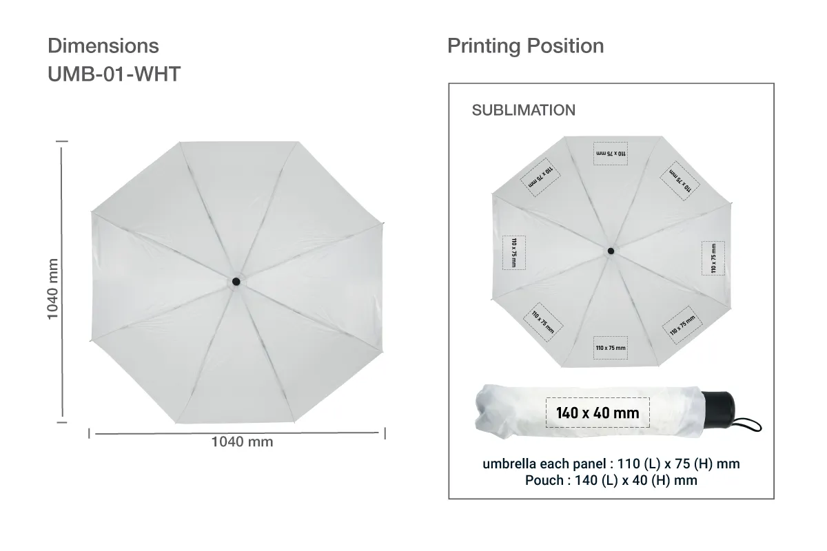 Compact and stylish 41-inch bi-fold manual umbrella in white, made from durable polyester. Includes Velcro closure and a matching pouch. Customizable with sublimation printing.