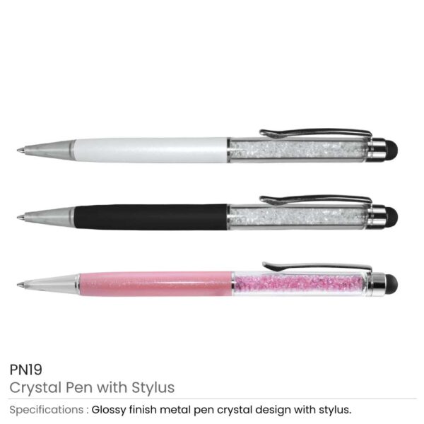 Crystal metal pens with a stylus are luxury pens. They had been created with shiny metallic material and crystals on glass. Thus, it is glossy and durable at the same time. This pen comprises a barrel. The lower part comprises glass with crystals while the upper part is colorful. The crystal part gives a shiny finish. Thus, making it more stylish. This pen comes with a stylus. The stylus is present at the top of the pen. Thus, you can use it on your smartphone. It also comes with multiple logo imprinting options. Thus, you can customize the logo of your company on these personalized pens in bulk.