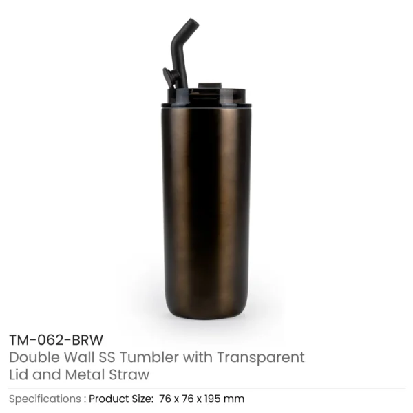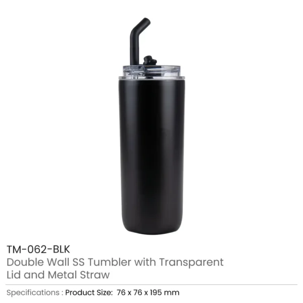 Double Wall SS Tumblers with Transparent Lid and Metal Straw – 500ml