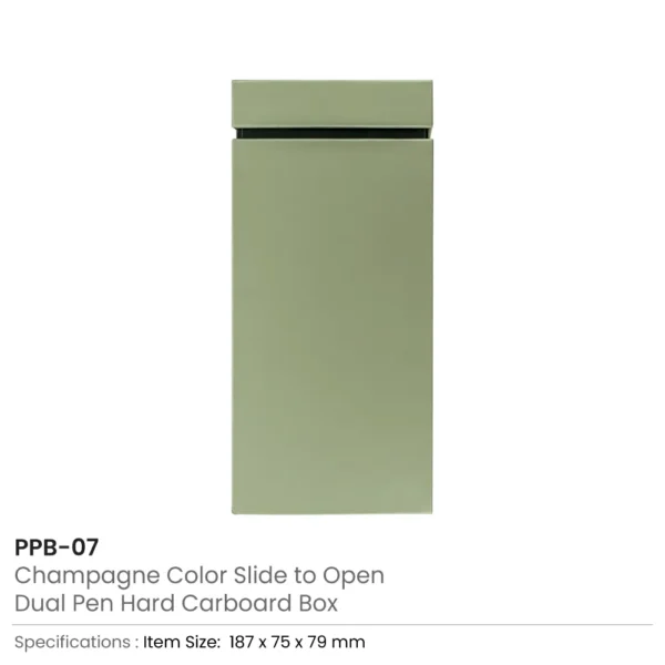 Present your pens in style with our elegant Dual Pen Box, crafted from durable hard cardboard in a premium champagne color. Designed with a convenient slide-to-open drawer style and a cream velvet foam interior, this box offers a luxurious display and protection for two pens. Perfect for corporate gifts, executive sets, and custom branding packaging.