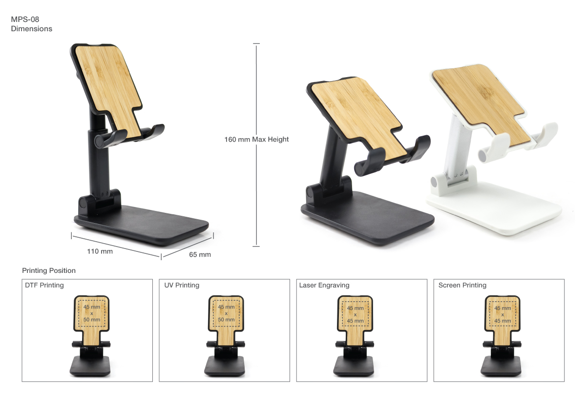 Promotional Adjustable & Foldable Phone Stands in ABS Plastic and Bamboo Material with Branding Options.