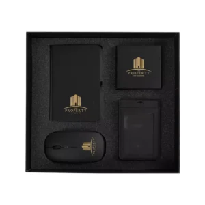 Premium Promotional Gift Sets GS-08 is a thoughtfully curated premium corporate gifting solution designed for professional branding and high-impact presentations. The set includes four practical office and lifestyle products, elegantly packed in a black magnetic closure gift box with inner cushioning for superior protection and an impressive unboxing experience.