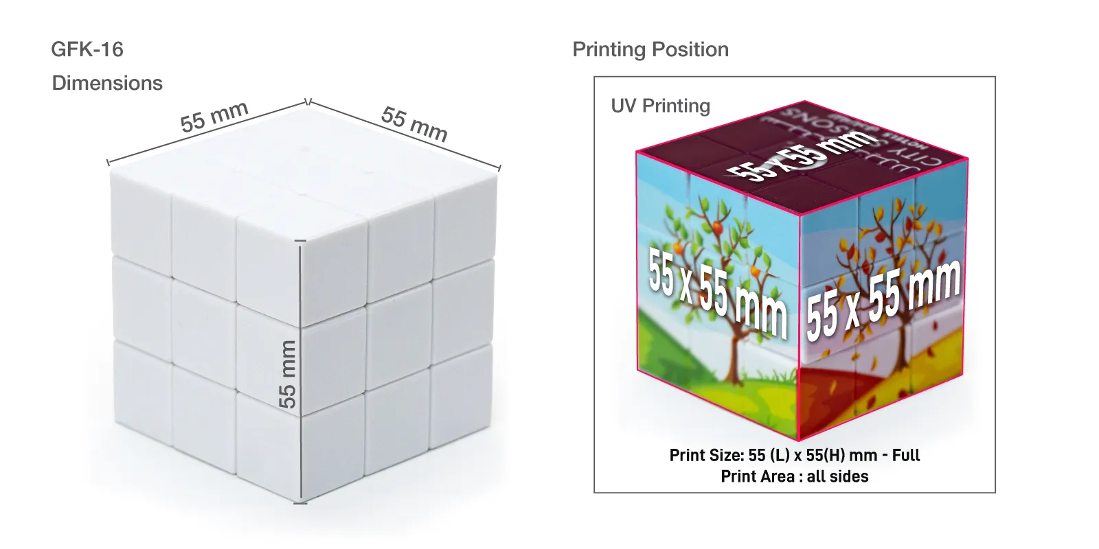 - Each square on the cube can be customized with your full-color artwork using UV printing.