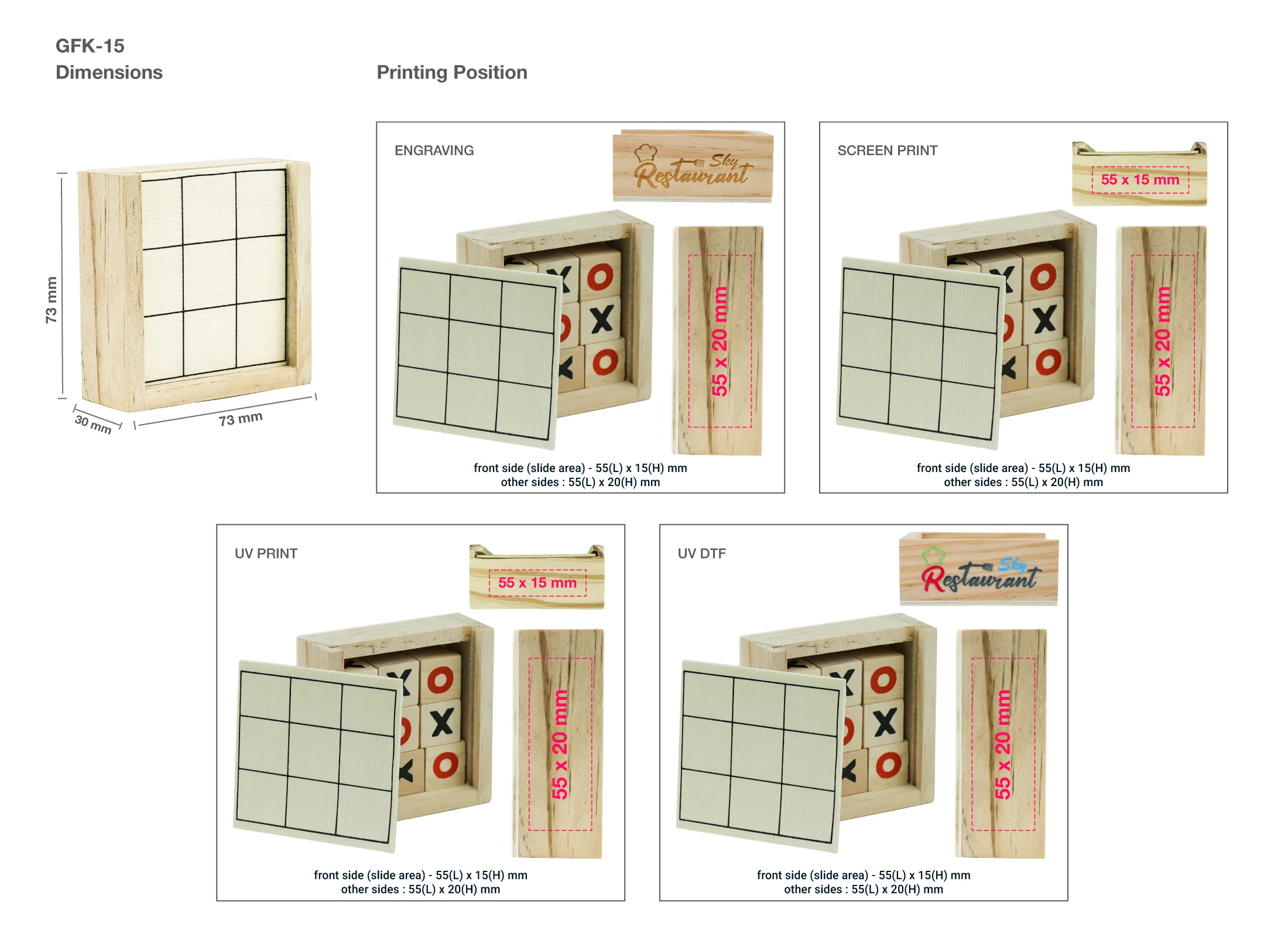 Classic Tic-Tac-Toe wooden board game with 9 solid wooden cubes. Comes in a slide-to-open wooden box that doubles as the playing board. Perfect for corporate gifts, educational purposes, and family entertainment.