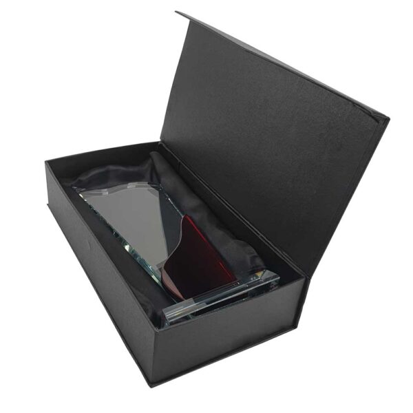 Crystal awards in clear and red color design with glass base packed in the black carton gift box.