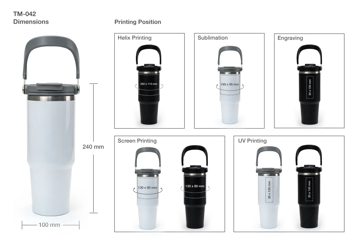 Tumbler in stainless steel double-wall vacuum insulated tumbler with flip-straw Lid and carry handle. The customized vacuum-insulated tumbler is ideal for keeping your beverage hot for hours. These tumblers are durable as they are made with premium quality stainless steel material. They also feature a double-wall design to maintain the freshness and taste of your drink.